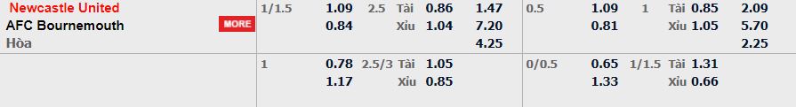 - Mức kèo nhà cái cược chấp trận này: Newcastle chấp 1,25 Trái. Newcastle ăn 1,09. Bounremouth ăn 0,84