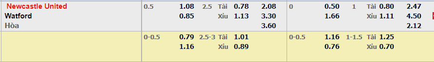 - Mức kèo nhà cái đưa ra trận này: Newcastle chấp 0,5 Trái. Newcastle ăn 1,08. Watford ăn 0,85