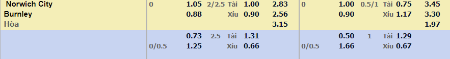 - Mức kèo nhà cái đưa ra trận này: Hòa – Được – Thua. Norwich ăn 1,05. Burnley ăn 0,88