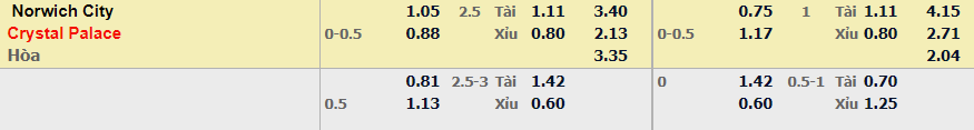 - Mức kèo nhà cái đưa ra trận này: Crystal Palace ăn 0,25 Trái. Norwich ăn 1,05. Crystal Palace ăn 0,88