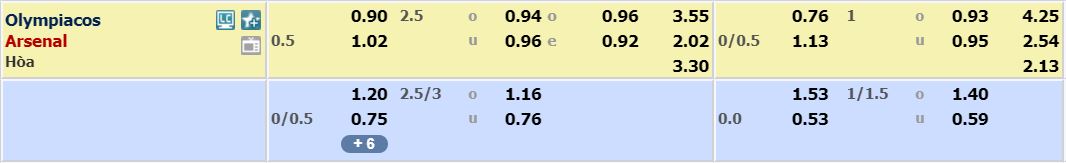 - Mức kèo bóng đá cược chấp nhà cái đưa ra cho cả trận: Arsenal chấp 0,5 trái. Olympiacos Piraeus ăn 0,90. Arsenal ăn 1,02