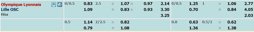 - Mức kèo nhà cái cược chấp trận này: Olympique Lyon chấp 0,25 Trái. Olympique Lyon ăn 0,83. Lille OSC ăn 1,09