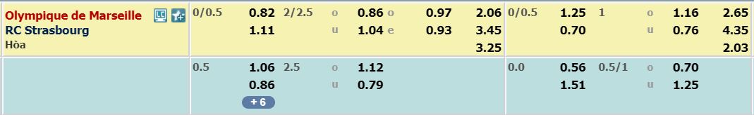 - Mức kèo nhà cái cược chấp trận này: Olympique Marseille chấp 0,25 Trái. Olympique Marseille ăn 0,82. Strasbourg ăn 1,11