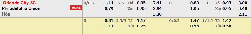 - Mức kèo nhà cái đưa ra trận này: Orlando chấp 0,25 Trái. Orlando ăn 1,14. Philadelphia Union ăn 0,79