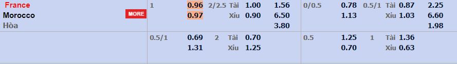 - Mức kèo nhà cái cược chấp trận này: Pháp chấp 1 Trái. Pháp ăn 0,96. Ma Rốc ăn 0,97