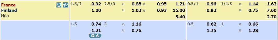 - Mức kèo nhà cái cược chấp trận này: Pháp chấp 1,75 trái. Pháp ăn 0,92. Phần Lan ăn 1,00