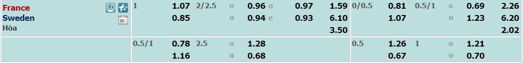 - Mức kèo nhà cái cược chấp trận này: Pháp chấp 1 trái. Pháp ăn 1,07. Thụy Điển ăn 0,85
