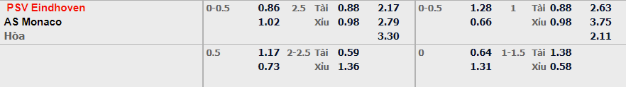 - Mức kèo nhà cái đưa ra trận này: PSV chấp 0,25 Trái. PSV ăn 0,86. AS Monaco ăn 1,02