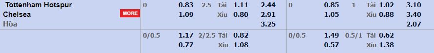 - Mức kèo nhà cái cược chấp trận này: Hòa – Được – Thua. Tottenham ăn 0,83. Chelsea ăn 1,09