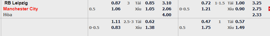 - Mức kèo nhà cái đưa ra trận này: Manchester City chấp 0,5 Trái. RB Leipzig ăn 0,87. Manchester City ăn 1,06