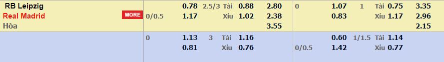 - Mức kèo nhà cái cược chấp trận này: Real Madrid chấp 2,5 trái. Leipzig ăn 0,78. Real Madrid ăn 1,17