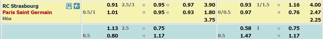 - Mức kèo nhà cái cược chấp trận này: Paris SG chấp 0,75 Trái. RC Strasbourg ăn 0,91. Paris SG ăn 1,01