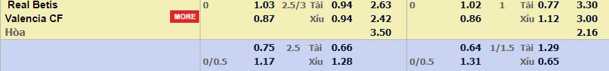 - Mức kèo nhà cái cược chấp trận này: Hòa – Được – Thua. Real Betis ăn 1,03. Valencia ăn 0,87