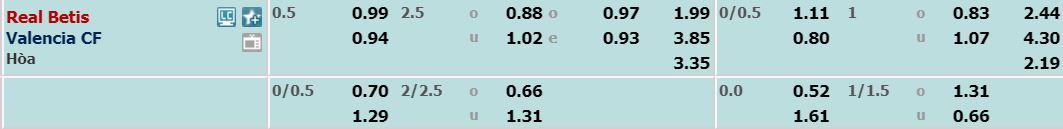 - Mức kèo nhà cái cược chấp trận này: Real Betis chấp 0,5 Trái. Real Betis ăn 0,99. Valencia ăn 0,94