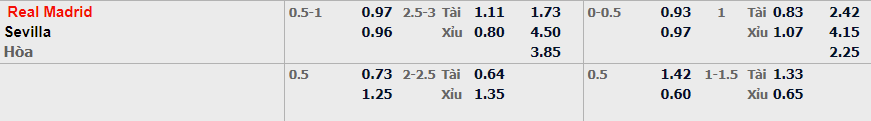 - Mức kèo nhà cái cược chấp trận này: Real Madrid chấp 0,75 Trái. Real Madrid ăn 0,97. Sevilla ăn 0,96