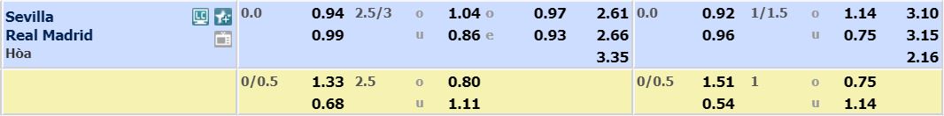 - Mức kèo bóng đá cược chấp nhà cái đưa ra cho cả trận: Hòa – Được – Thua. Sevilla ăn 0,94. Real Madrid ăn 0,99