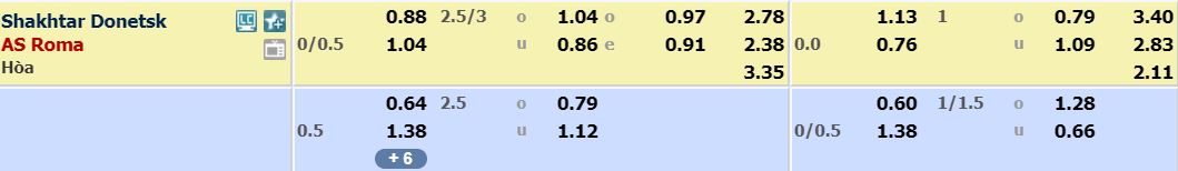 - Mức kèo nhà cái cược chấp trận này: AS Roma chấp 0,25 Trái. Shakhtar Donetsk ăn 0,88. AS Roma ăn 1,04