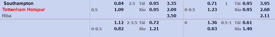 - Mức kèo nhà cái đưa ra trận này: Tottenham Hotspur chấp 0,5 Trái. Southampton ăn 0,84. Tottenham Hotspur ăn 1,09