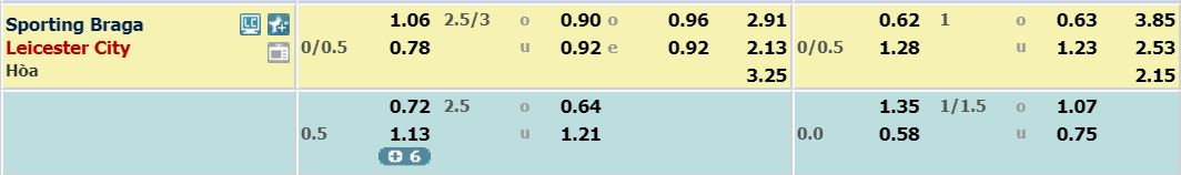 - Mức kèo nhà cái cược chấp trận này: Leicester City chấp 0.25 trái. Sporting Braga ăn 1,06. Leicester City ăn 0,78