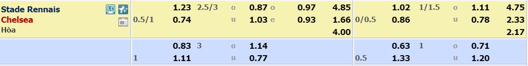 - Mức kèo nhà cái cược chấp trận này: Chelsea chấp 1 trái. Stade Rennes ăn 0,83. Chelsea ăn 1,11