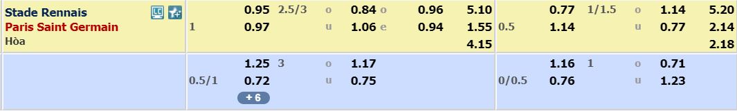 - Mức kèo nhà cái cược chấp trận này: Paris SG chấp 1 Trái. Stade Rennes ăn 0,95. Paris SG ăn 0,97