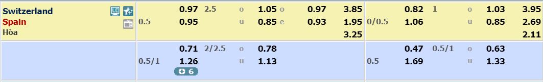 - Mức kèo nhà cái cược chấp trận này: Tây Ban Nha chấp 0,5 trái. Thụy Sĩ ăn 0,97. Tây Ban Nha ăn 0,95
