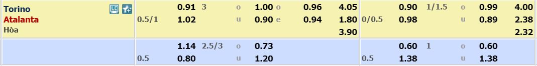 - Mức kèo chấp nhà cái đưa ra cho cả trận: Atalanta chấp 0,75 trái. Torino ăn 0,91. Atalanta ăn 1,02