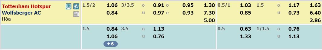 - Mức kèo bóng đá cược chấp nhà cái đưa ra cho cả trận: Tottenham Hotspur chấp 1,75 Trái. Tottenham Hotspur ăn 1,06. Wolfsberger AC ăn 0,84.