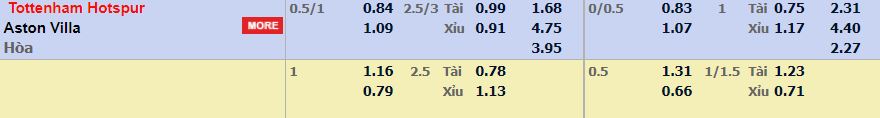- Mức kèo nhà cái cược chấp trận này: Tottenham chấp 0,75 Trái. Tottenham ăn 0,84. Aston Villa ăn 1,09