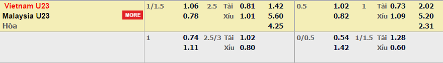 - Mức kèo nhà cái cược chấp trận này: U23 Việt Nam chấp 1,25 Trái. U23 Việt Nam ăn 1,06. U23 Malaysia ăn 0,78