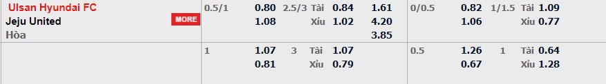 - Mức kèo nhà cái cược chấp trận này: Ulsan Hyundai chấp 0,75 Trái. Ulsan Hyundai ăn 0,80. Jeju Utd ăn 1,08