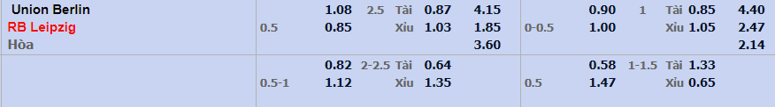 - Mức kèo nhà cái đưa ra trận này: RB Leipzig chấp 0,5 Trái. Union Berlin ăn 1,08. RB Leipzig ăn 0,85