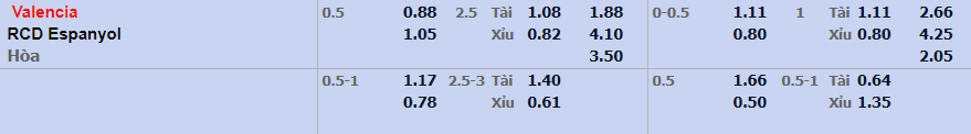 - Mức kèo nhà cái đưa ra trận này: Valencia chấp 0,5 Trái. Valencia ăn 0,88. Espanyol ăn 1,05