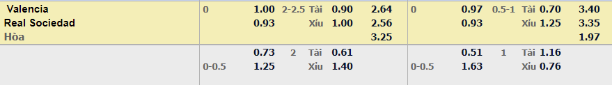 - Mức kèo nhà cái đưa ra trận này: Hòa – Được – Thua, Valencia ăn 1,00. Real Sociedad ăn 0,93