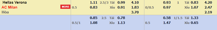 - Mức kèo nhà cái đưa ra trận này: AC Milan chấp 0,5 Trái. Verona ăn 1,11. AC Milan ăn 0,83