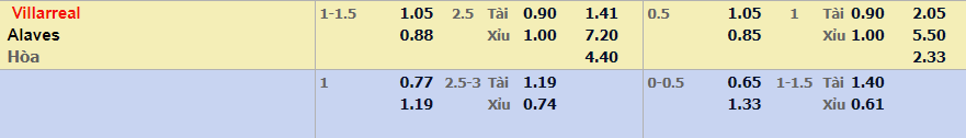 - Mức kèo nhà cái đưa ra trận này: Villarreal chấp 1,25 Trái. Villarreal ăn 1,05. Alaves ăn 0,88