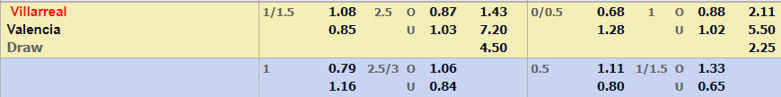 - Mức kèo nhà cái đưa ra trận này: Villarreal chấp 1,25 Trái. Villarreal ăn 1,08. Valencia ăn 0,85