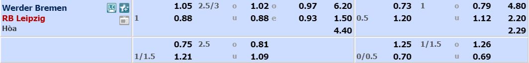 - Mức kèo nhà cái cược chấp trận này: RB Leipzig chấp 1 Trái. Werder Bremen ăn 1,05. RB Leipzig ăn 0,88