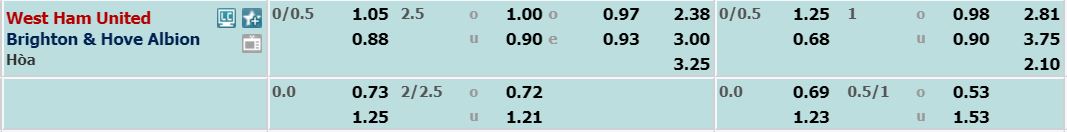 - Mức kèo nhà cái cược chấp trận này: West Ham chấp 0,25 trái. West Ham ăn 1,05. Brighton ăn 0,88
