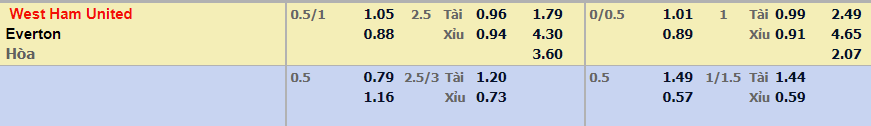 - Mức kèo nhà cái đưa ra trận này: West Ham chấp 0,75 Trái. West Ham ăn 1,05. Everton ăn 0,88