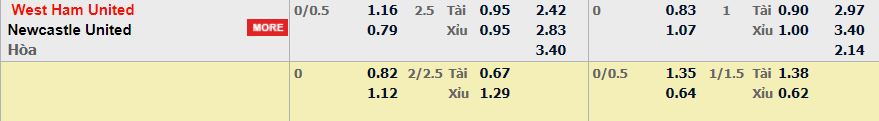 - Mức kèo nhà cái đưa ra trận này: West Ham chấp 0,25 trái. West Ham ăn 1,16. Newcastle ăn 0,79
