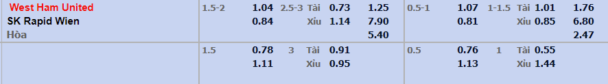 - Mức kèo nhà cái đưa ra trận này: West Ham chấp 1,75 Trái. West Ham ăn 1,04. Rapid Vienna ăn 0,84