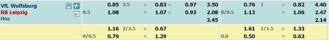 - Mức kèo nhà cái cược chấp trận này: RB Leipzig chấp 0,5 trái. Vfl Wolfburg ăn 0,85. RB Leipzig ăn 1,08
