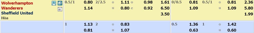 - Mức kèo nhà cái cược chấp trận này: Wolves chấp 0,75 Trái. Wolves ăn 0,80. Sheffield Utd ăn 1,14