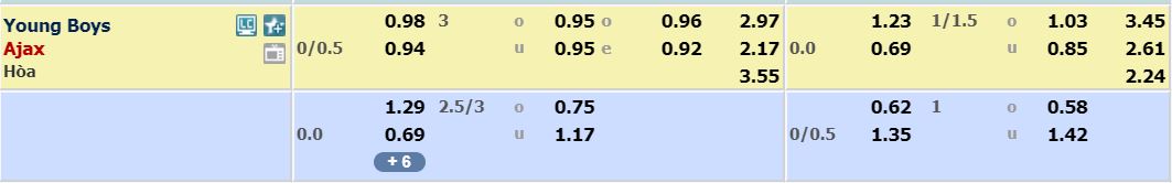 - Mức kèo nhà cái cược chấp trận này: Ajax Amsterdam chấp 0,25 Trái. Young Boys ăn 0,98. Ajax Amsterdam ăn 0,94
