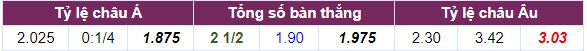 Số bàn thắng mà các nhà cái đưa ra cho trận đấu này chỉ là 2 1/4 trái. Đây là số bàn thắng được cho là khá phù hợp với thực lực và hoàn cảnh hiện tại của trận đấu này. Theo đó nếu lựa chọn của Tài tỷ lệ kèo ăn sẽ là 2.075 và nếu chọn cửa xỉu thì tỷ lệ ăn sẽ là 1.80