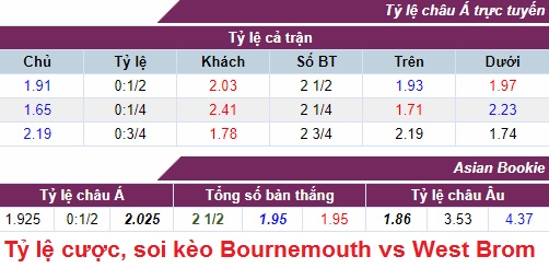 Tỷ lệ cược Bournemouth vs West Brom 22:00 17/03/2018