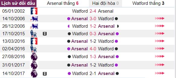 Lịch sử đối đầu của Arsenal vs Watford