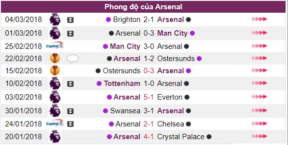 - Phong độ của Arsenal khá tệ với 4 trận thắng , 0 trận hòa và 6 trận thua trong 10 vòng đấu gần đây