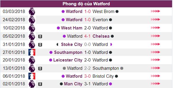 - Trong khi đó với 4 trận thắng, 2 trận hòa và 1 trận thua trong 10 trận thi đấu gần nhất trên mọi đấu trường. Phong độ thi đấu của Watford cũng không được đánh giá cao từ giới chuyên gia.